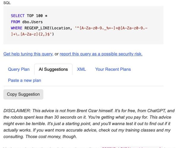 After you paste the plan, you’ve got a new AI Suggestions tab. It sends your query plan (and my custom prompt) up to ChatGPT 5.3, and in 30 seconds or less, you get a second opinion on ways to make it go faster: